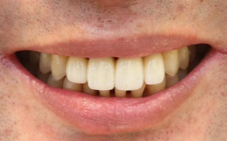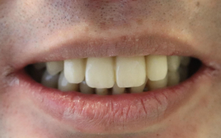 そこで、温存が難しい歯を抜いてから、その隣の右上の前歯1本(側切歯/2番)と左上の前歯2本(中切歯、側切歯)を連結して橋渡しのように歯を補う被せ物「ブリッジ」で治療する方法をご案内し、ご希望いただきました。