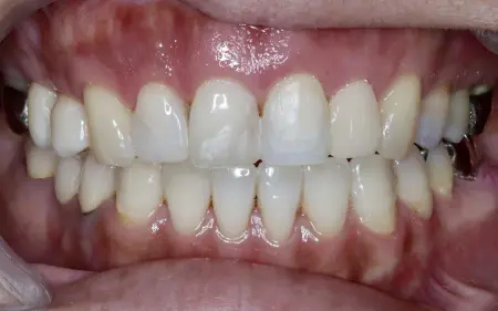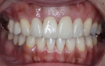 後日、完成したジルコニアクラウンを上の前歯4本に装着し、治療を終了しました。