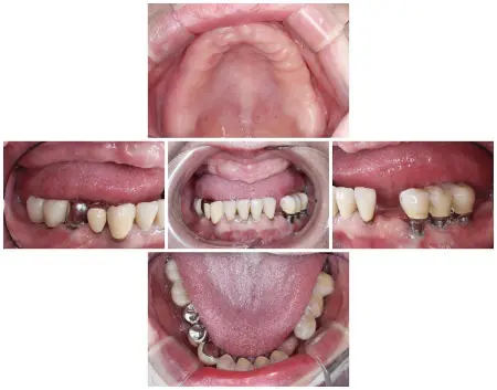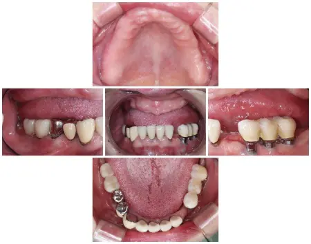 「20年以上前に他院で埋めた左上奥歯のインプラントの痛みと、10年前に作った右上の部分入れ歯が外れやすい。あと、ところどころ歯茎が腫れて痛みもあり、左下の歯がないのも気になる」とご相談いただきました。