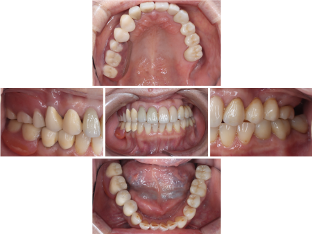 被せ物が装着されている歯のうち、左下の奥歯3本(第2小臼歯、第1大臼歯、第2大臼歯)と右上の前歯2本(中切歯/1番、側切歯/2番)は、過去に歯の神経が入っている管をきれいにして薬剤を詰める「根管治療」が行われており、右上の奥歯(第1小臼歯)と左上の前歯(犬歯/3番)、左上の奥歯(第1大臼歯)の3本は神経が残っていたものの、計6本については神経が炎症を起こしている状態でした。
