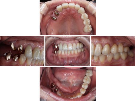拝見したところ、上の奥歯6本(左第1小臼歯/4番、左右第2小臼歯/5番、右第1大臼歯/6番、左右第2大臼歯/7番)と右下の奥歯2本(第1大臼歯、第2大臼歯)が欠損しており、その部分を補うために装着されていた義歯が劣化している状態でした。