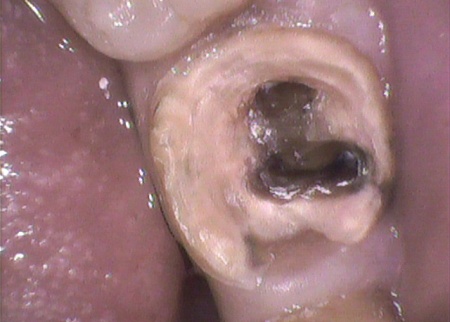 ①:塞がっていた根管口部を超音波で削り、根管を発見