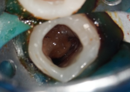 ②根管治療の最終段階である「根管充填」で使用する材料「ガッタパーチャポイント(GP)」の取り残しがあり硬くなっている。古いGPが残っていると、そこから汚れや細菌が入り込み細菌感染の原因になる場合がある
